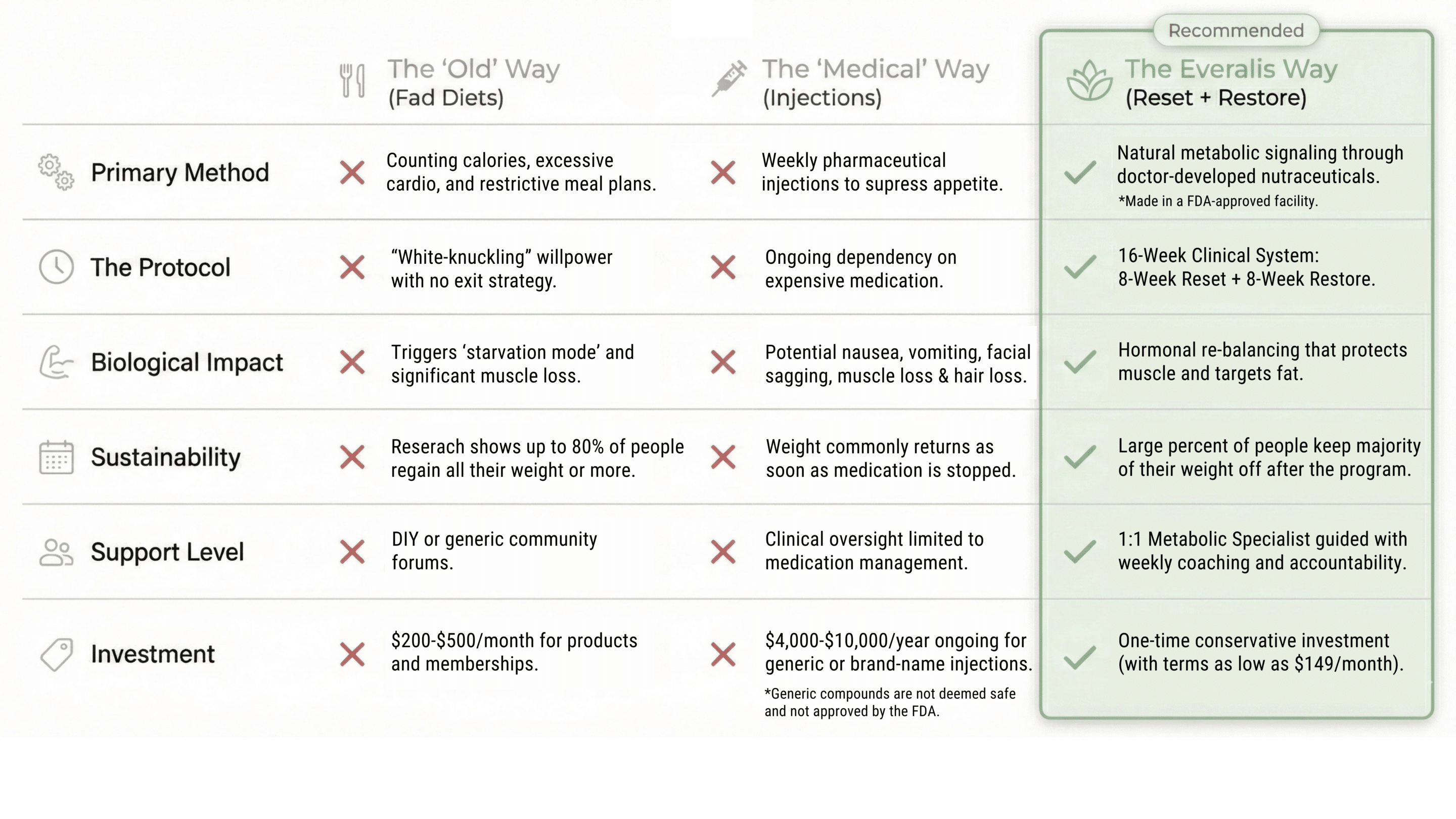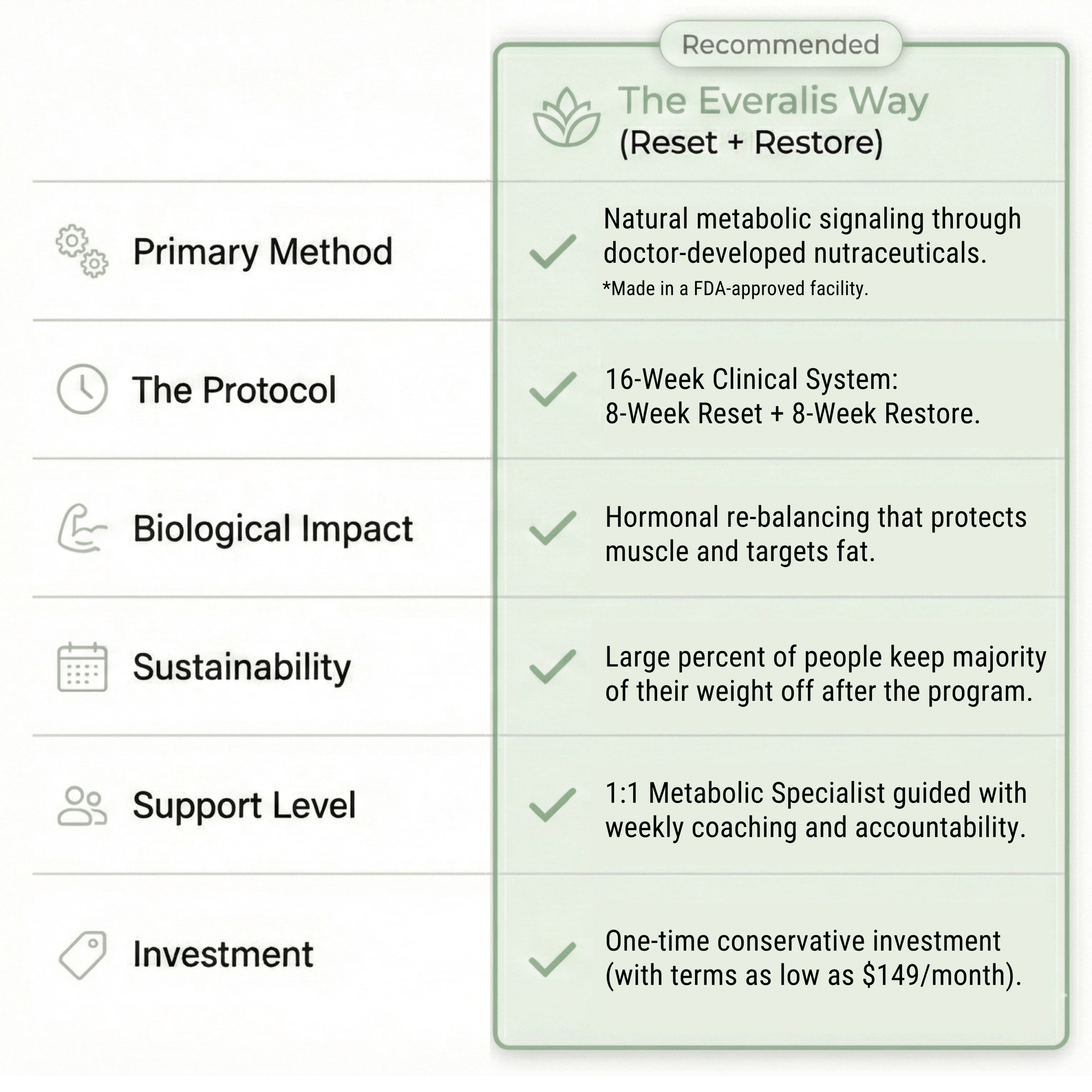 Injections are a chemical band-aid; Everalis is a biological renovation. Instead of a lifelong dependency on a drug, our 16-week protocol addresses the issues in your metabolic pathways to target fat while strictly protecting lean muscle— an essential factor for healthy aging. We don’t just suppress your appetite; we fix your metabolic baseline so you can graduate to long lasting stability without needles or ongoing prescriptions.